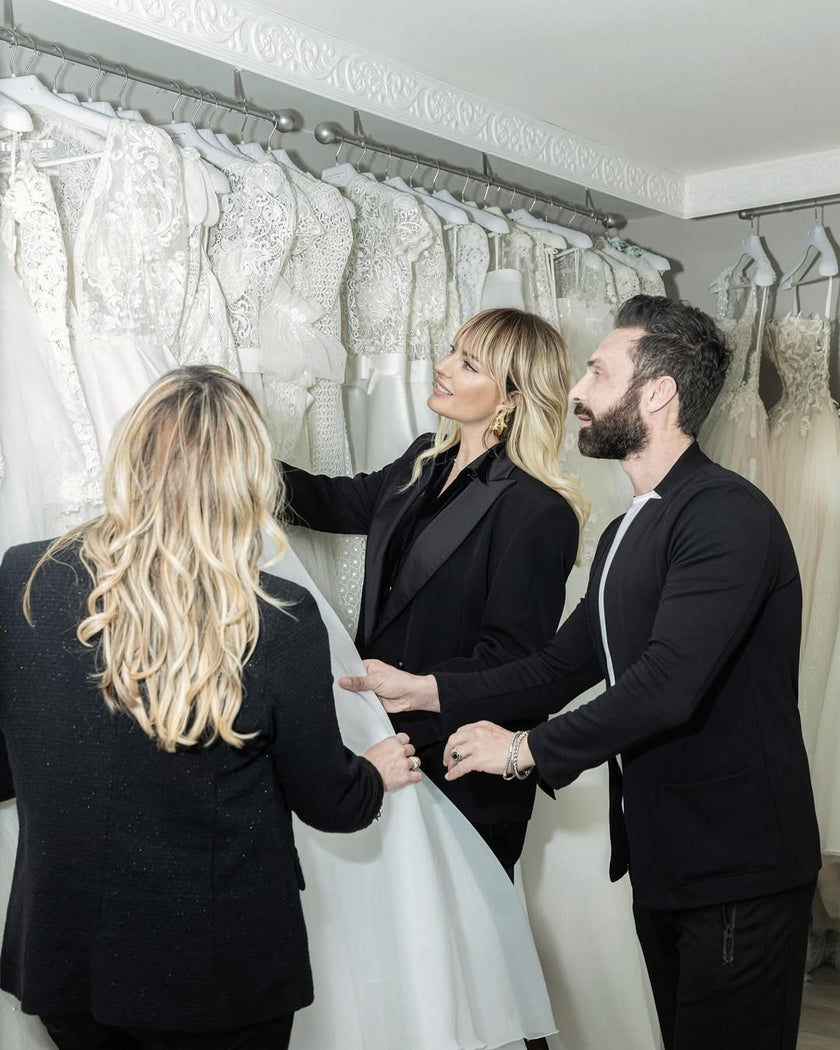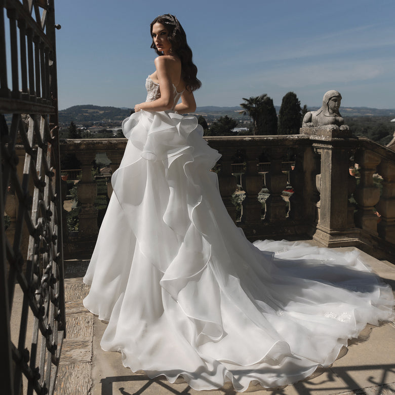 Pietro Demita's Diamond Couture wedding dresses, available at Rina's Bridal Couture, are the perfect choice for those dreaming of a dramatic, unconventional look. His collections celebrate theatrical elegance with architectural skirts, structured bodices, and jeweled details. Each design is a work of art designed to dazzle, ideal for the bride who wants to feel unique and the star of the show.